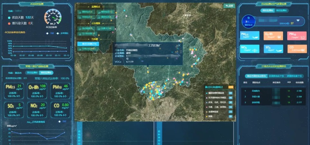 针对采集监测的大气中、水域监测有害气体的排放量、水质情况,针对环境监测点周边污染企业进行100米、300米、500米的范围内定位,跟进企业各项空气指标的排放标准及废水排放情况。针对排放量超标企业进行预警告知,并及时推送给相关单位。